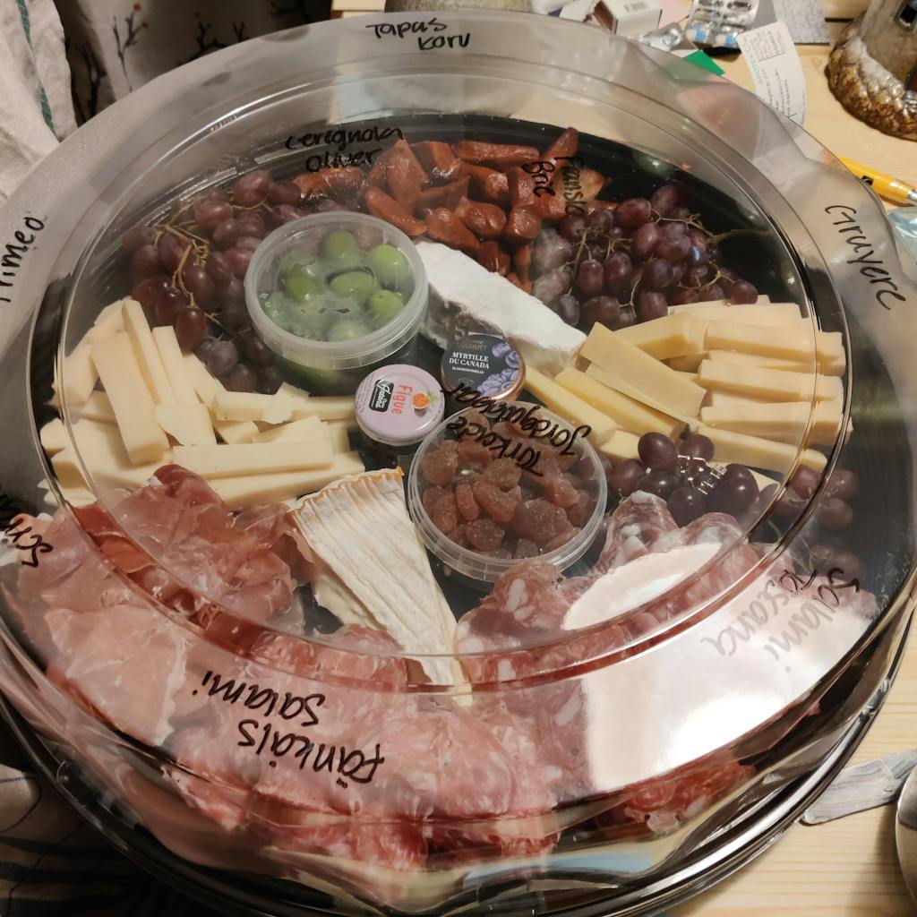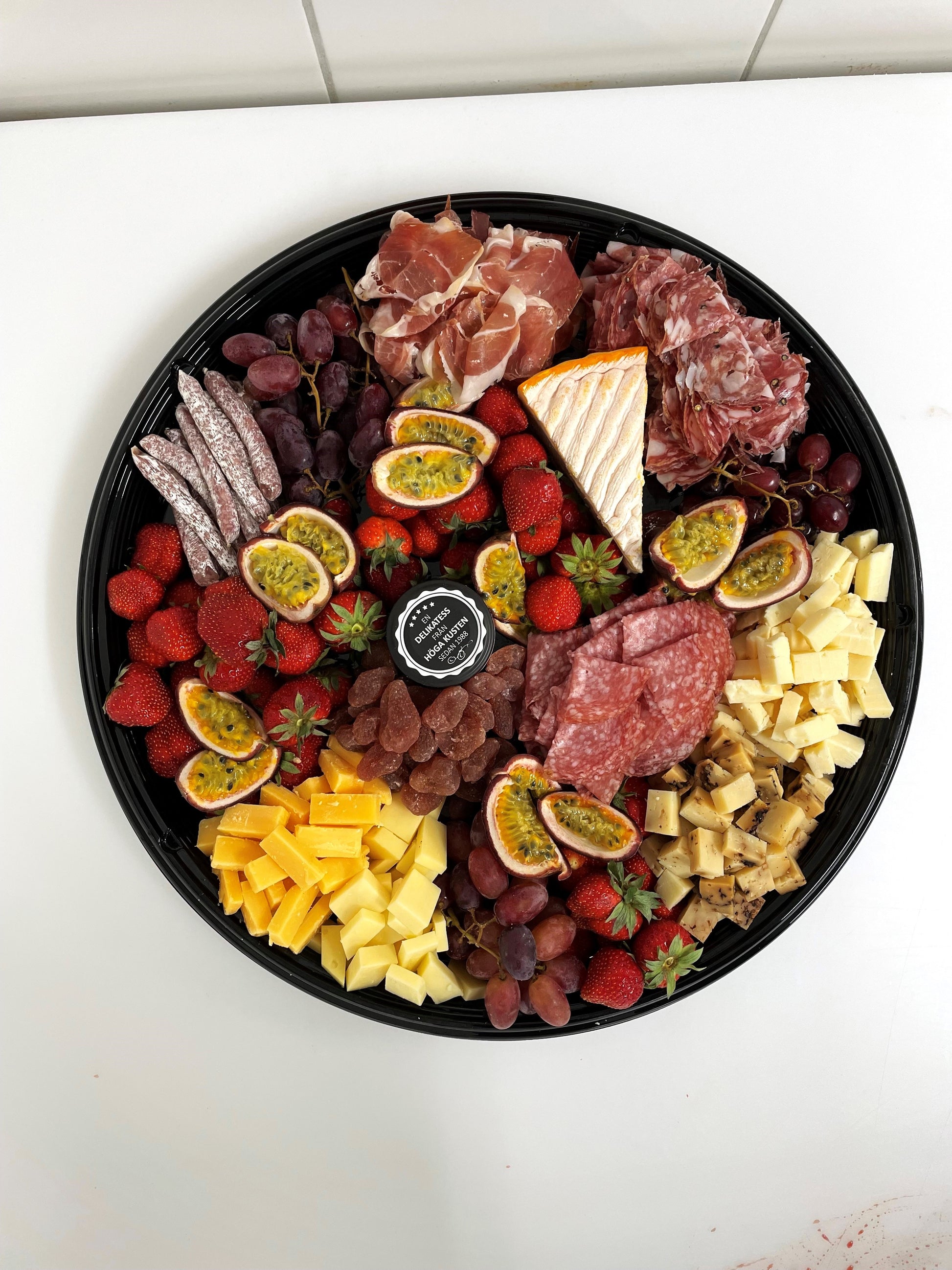 Brickan innehåller en blandning av ostar, salami, lufttorkat, oliver, marmelad, kex. Innehållet varierar från gång till gång beroende på utbud i våra ost och charkdiskar. Vi skriver på brickan vad allting är.
